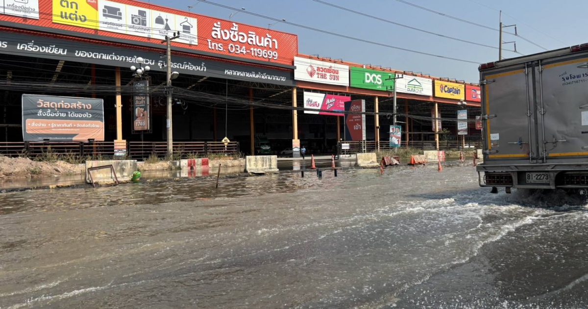 มีน้ำท่วมขังสองช่องทางซ้าย ประมาณ 10 ซม. ปริมาณรถปานกลาง รถชะลอตัว