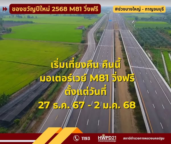 วิ่งฟรี เที่ยงคืนวันนี้ มอเตอร์เวย์ M81 ช่วงบางใหญ่ – กาญจนบุรี 7วิ่งฟรีช่วงเทศกาลปีใหม่ตั้ง