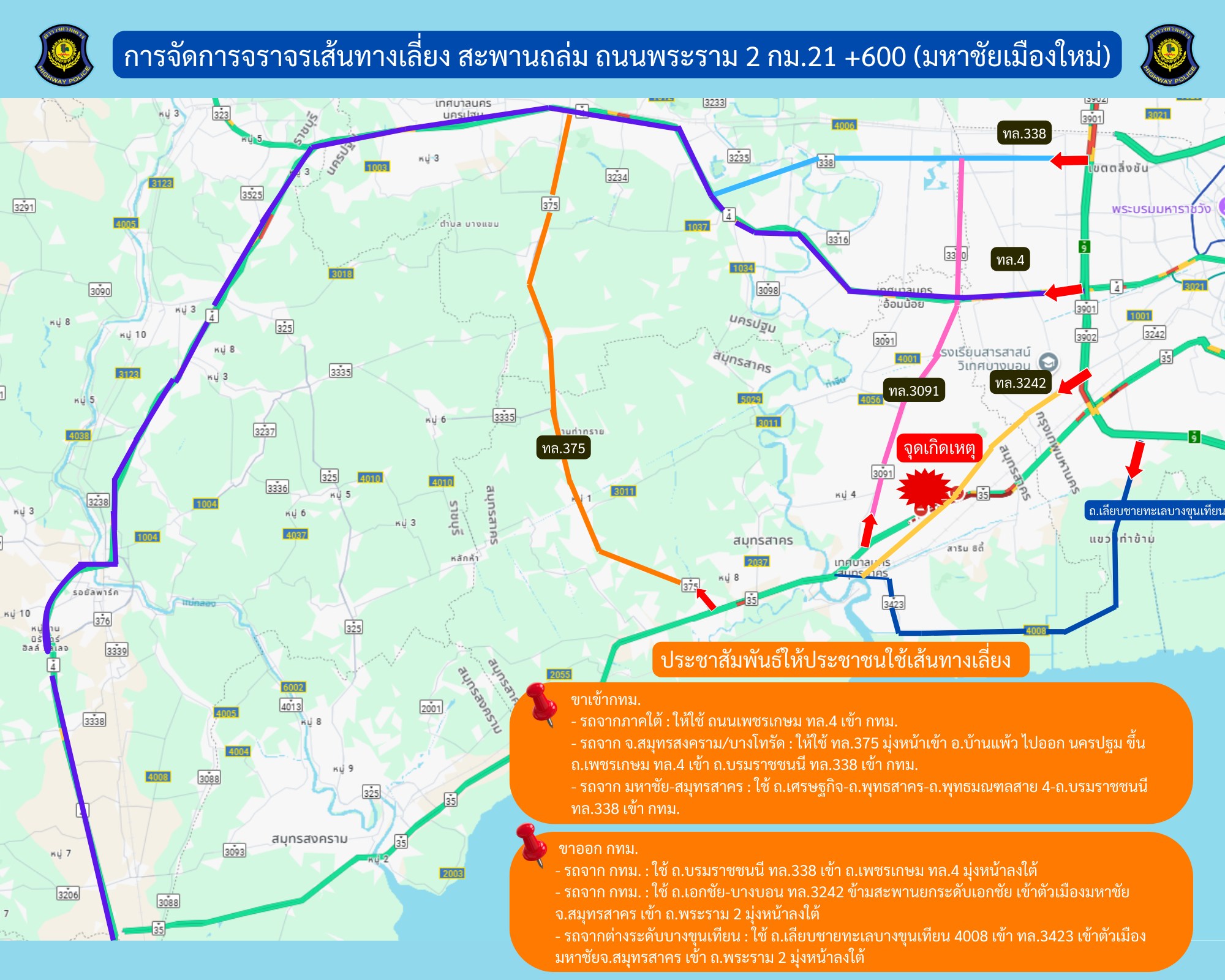 ประชาสัมพันธ์ให้ประชาชนใช้เส้นทางเลี่ยง จุดสะพานถล่ม ถ.พระราม2